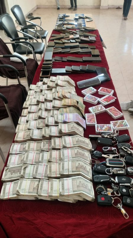 पुलिस ने मौके से 29 लाख रुपए नकद, 128 मोबाइल, कई लक्जरी कारें और बाइक जब्त की हैं।