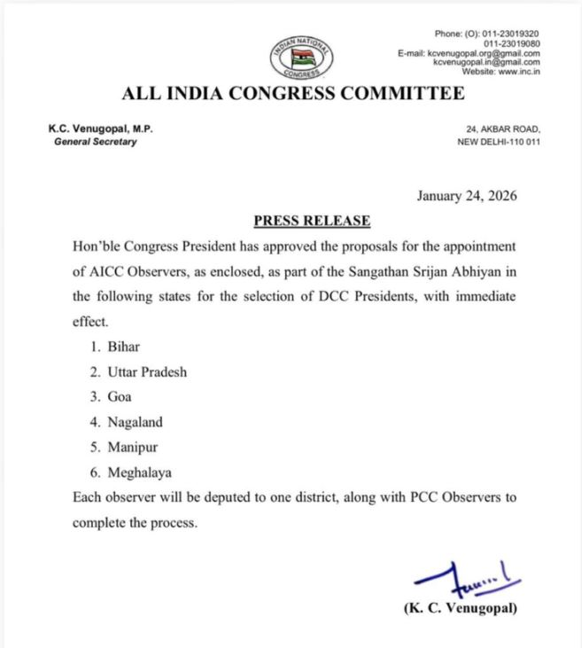 AICC Observer Appointed : नई दिल्ली। कांग्रेस अध्यक्ष मल्लिकार्जुन खरगे ने संगठन सृजन अभियान के अंतर्गत जिला कांग्रेस कमेटी (DCC) अध्यक्षों के चयन की प्रक्रिया को आगे बढ़ाते हुए छह राज्यों में AICC ऑब्ज़र्वरों की नियुक्ति के प्रस्तावों को तत्काल प्रभाव से मंज़ूरी दे दी है। जिन राज्यों में AICC ऑब्ज़र्वरों की नियुक्ति की गई है, उनमें बिहार, उत्तर प्रदेश, गोवा, नागालैंड, मणिपुर और मेघालय शामिल हैं।