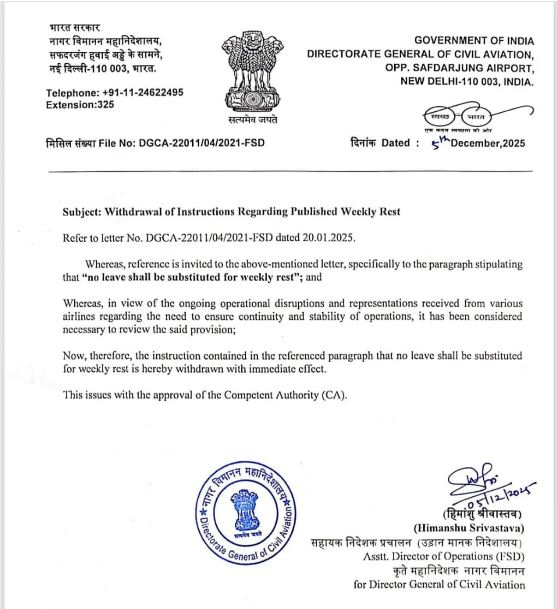 IndiGo Airlines बता दें DGCA ने रोस्टर जारी नए नियमों के तहत क्रू को अधिक आराम का समय देना जरूरी कहा था जिससे इंडिगो के बड़े नेटवर्क पर ऑपरेशनल दबाव बढ़ गया था। हालांकि, DGCA ने अब आदेश वापस लेने के बाद स्पष्ट किया है कि एयरलाइन अपनी संचालन क्षमता के अनुसार फ्लाइट शेड्यूल को व्यवस्थित कर सकती है।
