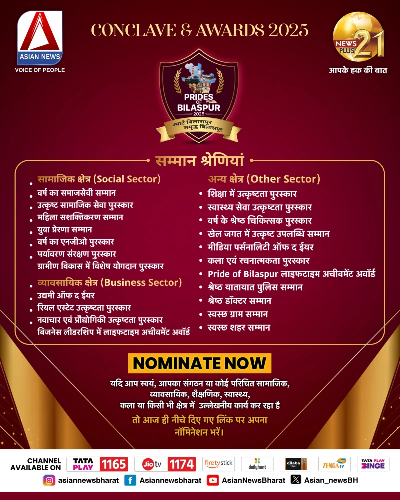 एशियन न्यूज़ एवं न्यूज़प्लस 21 लेकर आ रहा है... "Prides of Bilaspur 2025" Conclave & Awards, जल्दी करें.. QR कोड या लिंक के माध्यम से भेज सकते हैं नॉमिनेशन
