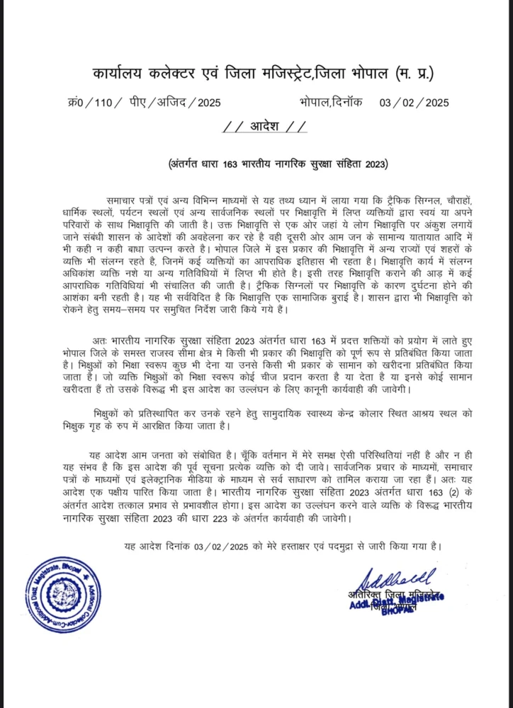 भोपाल। राजधानी भोपाल को भिखारी मुक्त करने कलेक्टर कोशलेंद्र विक्रम सिंह ने सम्पूर्ण जिले में भिक्षावृत्ति को पूर्ण रूप से प्रतिबंधित करने का आदेश जारी कर दिया है। आदेश के तहत भीख मांगना, देना अपराध की श्रेणी में आएगा। ऐसा करने वालों पर एफआईआर दर्ज कराई जाएगी। दोनों की पहचान चौराहे पर लगे सीसीटीवी कैमरों से की जाएगी। बता दें की 25 जनवरी को इंदौर के बाद भोपाल में भी एक भिखारी पर मामला दर्ज हो चुका है।