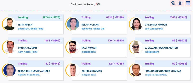 Bihar Election Vote Counting Live: पटना। भारतीय चुनाव आयोग के आधिकारिक पार्टी-वार रुझानों के सुबह 11 बजे तक की मतगणना में , जेडी (यू) 83 सीटों पर आगे चल रही है, उसके बाद बीजेपी 80 और आरजेडी 33 सीटों पर आगे है। बांंकीपुर विधानसभा सीट से बीजेपी के छत्तीसगढ़ प्रभारी व पथ निर्माण मंत्री नितिन नवीन अपने निकटतम प्रतिद्वंदी आरजेडी की रेखा कुमार से 19 हजार से ज्यादा वोटों से आगे चल रहे हैं।