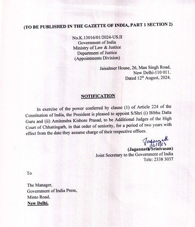 Bilaspur News : केंद्र ने छत्तीसगढ़ हाईकोर्ट में की 2 अतिरिक्त जजों की नियुक्ति, अधिसूचना जारी