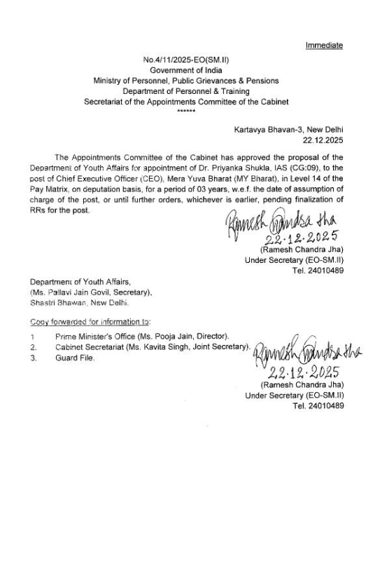 कार्मिक एवं प्रशिक्षण विभाग (DoPT) द्वारा जारी आदेश के मुताबिक, डॉ. प्रियंका शुक्ला की यह नियुक्ति प्रतिनियुक्ति आधार पर तीन वर्षों के लिए की गई है। उन्हें पे मैट्रिक्स लेवल-14 के अंतर्गत यह जिम्मेदारी सौंपी गई है। नियुक्ति पदभार ग्रहण करने की तिथि से प्रभावी होगी या अगले आदेश तक लागू रहेगी। साथ ही यह व्यवस्था तब तक प्रभावी रहेगी, जब तक MY Bharat के CEO पद के लिए भर्ती नियमों को अंतिम रूप नहीं दिया जाता।