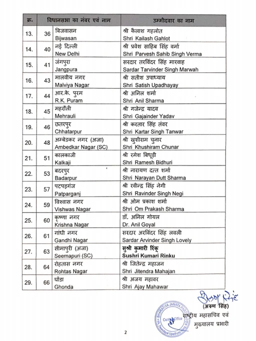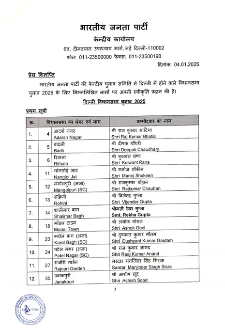 Breaking News: नई दिल्ली: बीजेपी ने 2025 विधानसभा चुनाव के लिए अपनी पहली उम्मीदवारों की सूची जारी की, पार्वेश वर्मा नई दिल्ली सीट से अरविंद केजरीवाल के खिलाफ चुनाव लड़ेंगे। दुश्यंत गौतम को करोल बाग, मंजींदर सिंह सिरसा को राजौरी गार्डन, कैलाश गहलोत को बिजवासन और अरविंदर सिंह लवली को गांधी नगर से टिकट दिया गया।