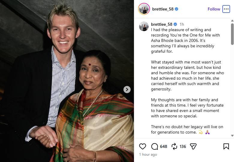 उन्होंने कहा कि आशा भोसले सिर्फ एक महान गायिका ही नहीं थीं, बल्कि बेहद विनम्र और सादगीपूर्ण व्यक्तित्व की धनी भी थीं। उनकी गर्मजोशी और उदारता हर किसी को प्रभावित करती थी। ब्रेट ली ने उनके परिवार और करीबियों के प्रति संवेदना व्यक्त करते हुए कहा कि उनकी विरासत हमेशा जीवित रहेगी।