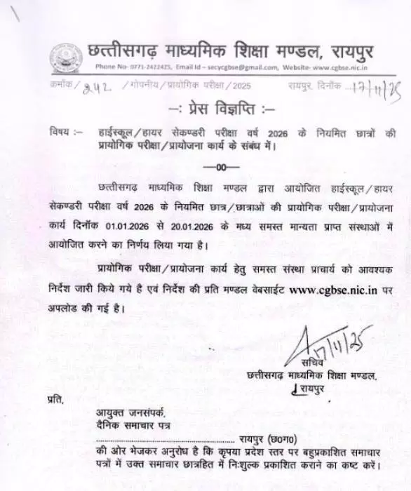 CG Board: प्रायोगिक परीक्षाओं का यह कार्यक्रम केवल रेगुलर छात्रों के लिए जारी हुआ है। स्वाध्यायी या प्राइवेट छात्रों की प्रायोगिक परीक्षाएं सैद्धांतिक परीक्षाओं के दौरान, दो पेपर्स के अंतराल में कराई जाएंगी, जिसके लिए अलग से अधिसूचना जारी होगी। प्राचार्यों को विस्तृत दिशा-निर्देश दिए गए हैं कि वे निर्धारित समयसीमा में प्रायोगिक परीक्षा और प्रायोजना कार्य दोनों संपन्न कराएं।