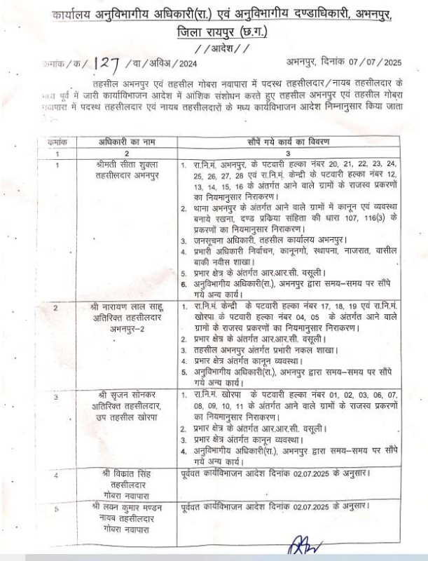 CG Breaking : तहसीलदारों के कार्यविभाजन में बदलाव, अभनपुर एसडीएम ने जारी किया नया आदेश