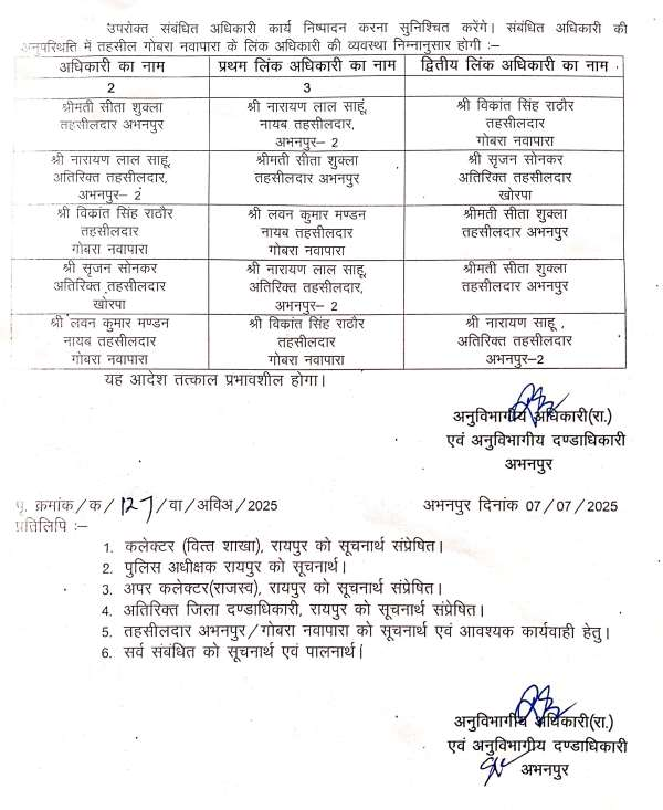 जानकारी के अनुसार, अभनपुर एसडीएम ने प्रशासनिक कार्यों को और अधिक सुचारू बनाने के उद्देश्य से यह कदम उठाया है।