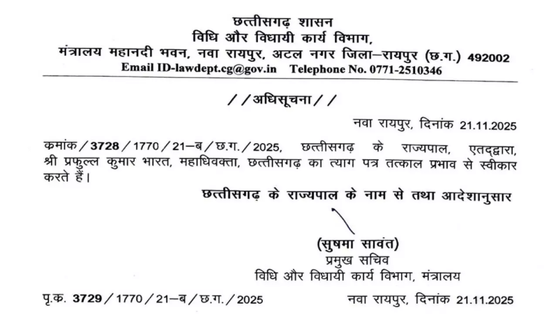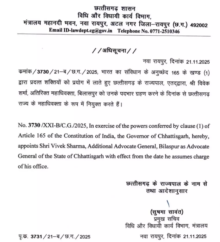 CG Breaking: छत्तीसगढ़ में नया महाधिवक्ता नियुक्त, विवेक शर्मा को मिली जिम्मेदारी, एन. प्रफुल्ल भारत के इस्तीफा देने के बाद से खाली था पद