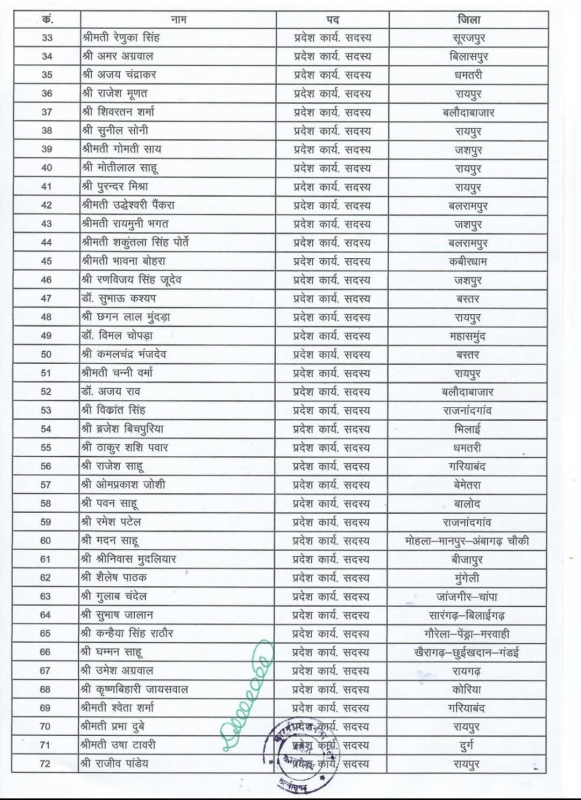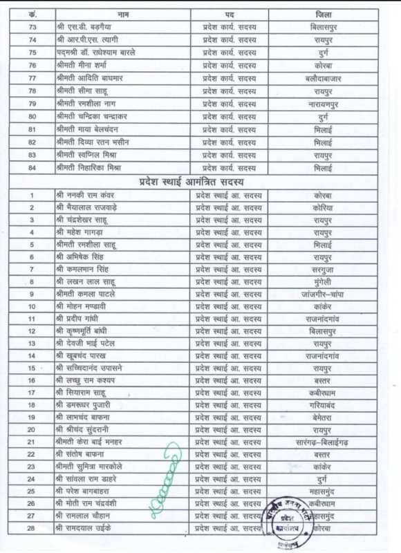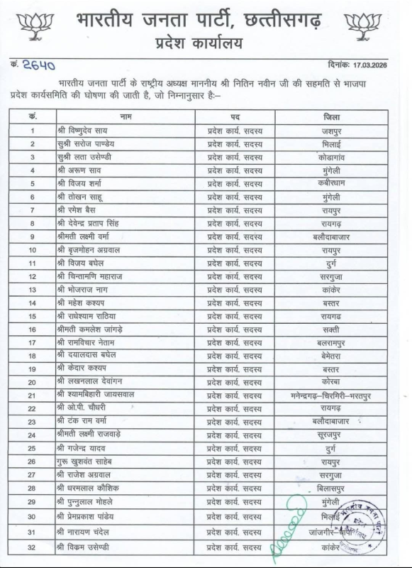 CG Breaking : रायपुर। भारतीय जनता पार्टी की छत्तीसगढ़ इकाई ने अपनी नई प्रदेश कार्यसमिति की घोषणा कर दी है। इस नई टीम में मुख्यमंत्री विष्णुदेव साय सहित कुल 84 नेताओं को शामिल किया गया है।