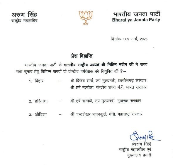 CG Breaking: रायपुर। बिहार में होने वाले राज्य सभा चुनाव के लिए भाजपा ने छत्तीसगढ़ के डिप्टी सीएम विजय शर्मा को केंद्रीय पर्यवेक्षक नियुक्त किया है।