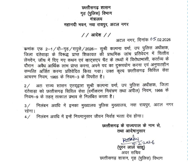 CG Breaking : रायपुर। छत्तीसगढ़ शासन ने दंतेवाड़ा में पदस्थ डीएसपी कल्पना वर्मा को तत्काल प्रभाव से निलंबित कर दिया है। गृह (पुलिस) विभाग द्वारा जारी आदेश में उनके खिलाफ गंभीर अनियमितताओं का उल्लेख किया गया है। प्राथमिक जांच में वित्तीय लेनदेन, जांच के दौरान दिए गए कथनों और व्हाट्सएप चैट से जुड़े तथ्यों में विरोधाभास पाए गए हैं।