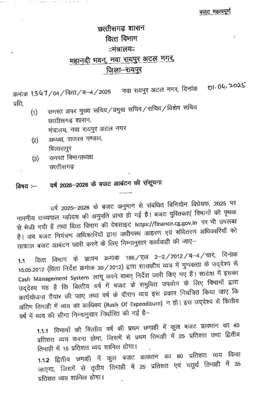 CG Budget Allocation Financial Year 2025-26: छत्तीसगढ़ सरकार ने वित्तीय वर्ष 2025-26 के लिए बजट आवंटन जारी कर दिया है। वित्त सचिव मुकेश बंसल ने सभी विभागों को निर्देश जारी किए हैं। जारी निर्देश में सरकार ने