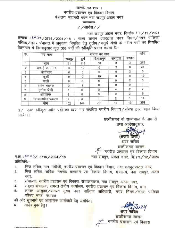 CG News : रायपुर। छत्तीसगढ़ के नगरीय प्रशासन विभाग ने एक महत्वपूर्ण कदम उठाते हुए 353 लंबित अनुकंपा नियुक्ति प्रकरणों को स्वीकृति दे दी है। उप मुख्यमंत्री ने इन नियुक्तियों की मंजूरी प्रदान की, जिसके बाद अब नगर निगम, नगर पालिका, नगर परिषद और नगर पंचायतों में विभिन्न पदों पर नियुक्तियां की जाएंगी।