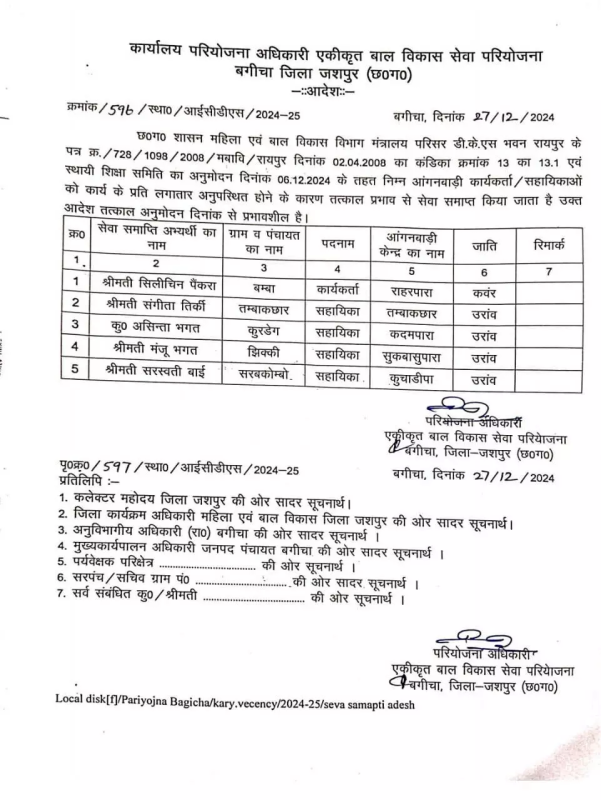 CG News : जशपुर। छत्तीसगढ़ के जशपुर जिले के बगीचा विकासखंड में महिला एवं बाल विकास विभाग ने अनुशासनात्मक कार्रवाई करते हुए आंगनबाड़ी केंद्र की 1 कार्यकर्ता और 4 सहायिकाओं को तत्काल प्रभाव से सेवा से बर्खास्त कर दिया है। यह कदम उनके लंबे समय से अनुपस्थित रहने और कार्य में गंभीर लापरवाही के कारण उठाया गया है।