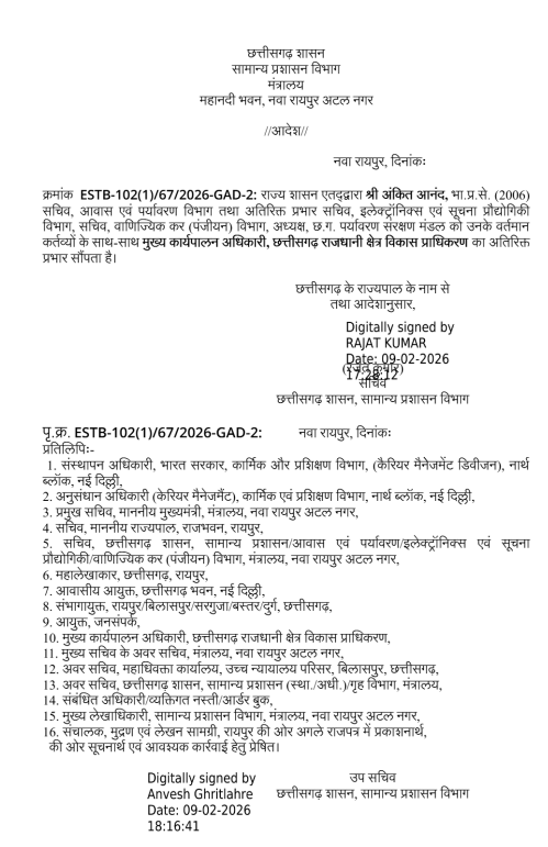 CG News: छत्तीसगढ़ में प्रशासनिक फेरबदल, IAS अंकित आनंद को सीआरडीए का अतिरिक्त प्रभार, सामान्य प्रशासन विभाग ने जारी किया आदेश