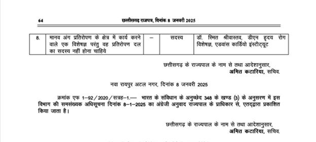 CG News : इसके साथ ही रायपुर के दाऊ कल्याण सुपर स्पेशलिटी हॉस्पिटल की प्रोफेसर सर्जरी और अधीक्षक डॉ. शिप्रा शर्मा को भी समिति का सदस्य बनाया गया है। अपर संचालक और संयुक्त संचालक, स्वास्थ्य एवं परिवार कल्याण विभाग को समिति में सदस्य सचिव की जिम्मेदारी दी गई है। यह समिति अगले दो वर्षों तक राज्य में मानव अंग प्रतिरोपण से जुड़े मामलों पर काम करेगी।