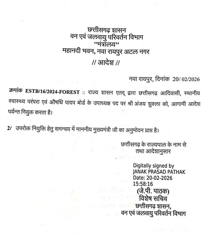 CG News: अंजय शुक्ला को मिली बड़ी जिम्मेदारी, औषधि पादप बोर्ड के बने उपाध्यक्ष CG News: रायपुर। छत्तीसगढ़ शासन के वन एवं जलवायु परिवर्तन विभाग द्वारा एक महत्वपूर्ण प्रशासनिक आदेश जारी किया गया है। मंत्रालय, महानदी भवन से 20 फरवरी 2026 को जारी आदेश (क्रमांक ESTB/16/2024-FOREST) के तहत अंजय शुक्ला को छत्तीसगढ़ आदिवासी, स्थानीय स्वास्थ्य परंपरा एवं औषधि पादप बोर्ड का उपाध्यक्ष नियुक्त किया गया है। विभाग द्वारा जारी आदेश में उल्लेख किया गया है कि उनकी नियुक्ति आगामी आदेश तक प्रभावी रहेगी। शासन के इस निर्णय को विभागीय कार्यों को सुदृढ़ करने और पारंपरिक स्वास्थ्य पद्धतियों के संरक्षण एवं संवर्धन की दिशा में महत्वपूर्ण कदम माना जा रहा है।