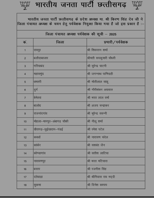 CG News : भाजपा ने किया जिला पंचायत अध्यक्ष नियुक्ति के लिए पर्यवेक्षक नियुक्त, देखें लिस्ट...