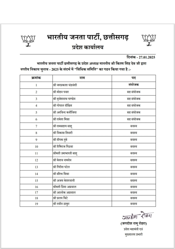 CG News : रायपुर। छत्तीसगढ़ में आगामी नगरीय निकाय चुनाव के मद्देनजर भारतीय जनता पार्टी (बीजेपी) ने अपनी तैयारियों को तेज कर दिया है। पार्टी ने निकाय चुनाव के लिए एक 19 सदस्यीय विधिक समिति का गठन किया है, ताकि चुनावी प्रक्रिया में विधिक पक्ष को मजबूती दी जा सके। बीजेपी ने अपनी इस विधिक समिति के संयोजक के रूप में जय प्रकाश चंद्रवंशी को नियुक्त किया है।