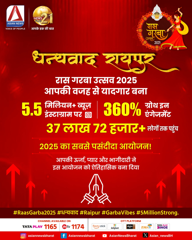 CG News: रायपुर। एशियन न्यूज और न्यूजप्लस 21 द्वारा आयोजित मध्य भारत के सबसे भव्य रास गरबा उत्सव ने छत्तीसगढ़वासियों का दिल जीत लिया। नवरात्रि का यह पर्व रायपुर के लोगों के लिए यादगार बन गया। यह आयोजन न सिर्फ गरबा और डांडिया का उत्सव था, बल्कि सनातन संस्कृति को बढ़ावा देने का एक मजबूत संकल्प भी रहा। रायपुर सहित प्रदेश के हजारों लोग इस उत्सव के साक्षी बने। वहीं एशियन न्यूज और न्यूज प्लस 21 के सोशल मीडिया प्लेटफार्म ने भी इतिहास रच दिया। 27 से 29 सितंबर तक यानी तीन दिन में इंस्टाग्राम पर हमें 55 लाख 23 हजार 413 व्यूज मिले और हमारी पहुंच 37 लाख 32 हजार 516 रही। यह ऐतिहासिक सफलता सिर्फ हमें रास-गरबा के महा उत्सव से मिली है।
