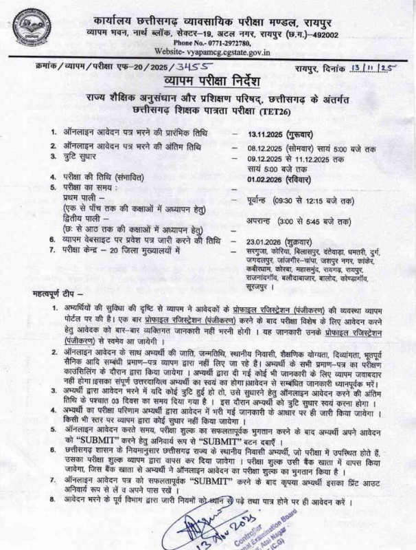 जारी शेड्यूल के अनुसार, CG TET 2025-26 परीक्षा का आयोजन 1 फरवरी 2026 को किया जाएगा।