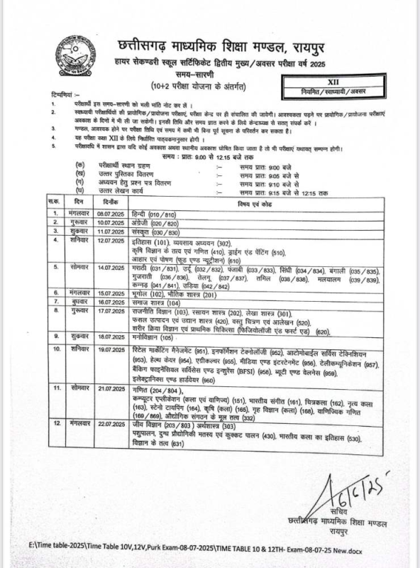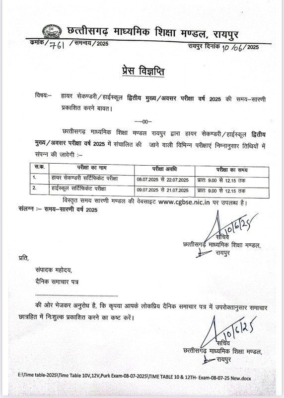 CGBSE के अनुसार, 12वीं की द्वितीय मुख्य परीक्षा 8 जुलाई 2025 से शुरू होकर 22 जुलाई 2025 तक चलेगी। वहीं, 10वीं की द्वितीय मुख्य परीक्षा 9 जुलाई 2025 से शुरू होकर 21 जुलाई 2025 तक आयोजित की जाएगी। सभी परीक्षाएं सुबह 9:00 बजे से दोपहर 12:15 बजे तक एकल पाली में होंगी। परीक्षा का समय पत्र वितरण, पढ़ने और अन्य औपचारिकताओं के लिए 15 मिनट अतिरिक्त शामिल करेगा। छात्रों को सलाह दी गई है कि वे समय पर परीक्षा केंद्र पहुंचें और अपने प्रवेश पत्र (एडमिट कार्ड) साथ लाएं।