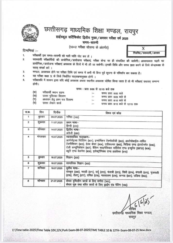 CG News : CGBSE ने जारी किया 10वीं-12वीं द्वितीय अवसर परीक्षा 2025 का टाइम टेबल, 8 जुलाई से शुरू होंगे एग्जाम