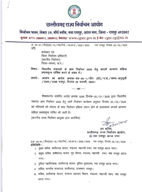 CG News : त्रिस्तरीय पंचायत चुनाव के बाद आचार संहिता समाप्त, राज्य निर्वाचन आयोग ने जारी किया आदेश...