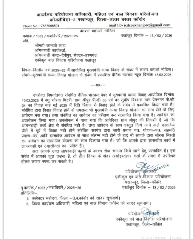 CG News : कन्या विवाह योजना में फर्जीवाड़ा, पहले से शादीशुदा जोड़े ने दोबारा शादी कर ली 50 हजार की सरकारी राशि, आंगनबाड़ी कार्यकर्ता को नोटिस जारी