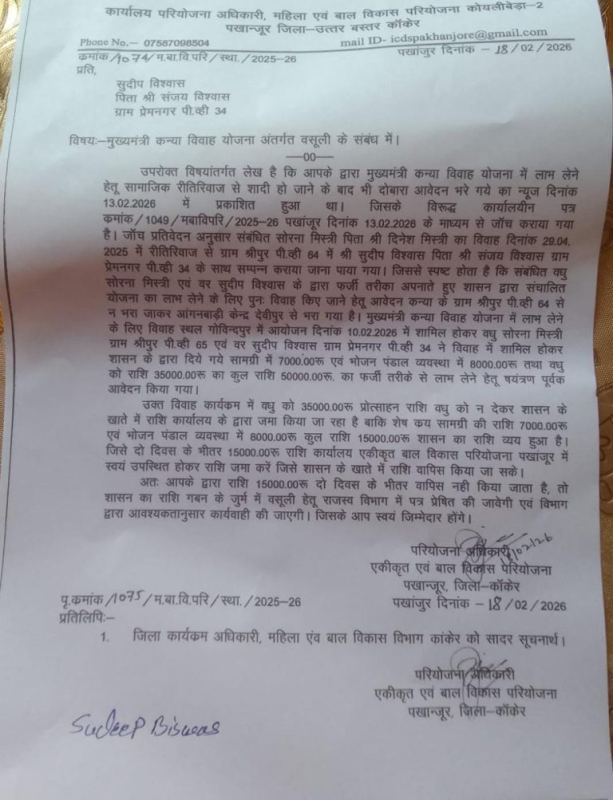 CG News : पखांजूर। पखांजूर से एक चौंकाने वाला मामला सामने आया है। मुख्यमंत्री कन्या विवाह योजना के तहत आर्थिक प्रोत्साहन राशि के लालच में कांकेर जिले के एक जोड़े ने पहले से विवाहिता होने के बावजूद दोबारा शादी कर 50 हजार रुपए की सरकारी राशि लेने का प्रयास किया। मामला उजागर होने के बाद महिला एवं बाल विकास विभाग ने सख्त कदम उठाए हैं।