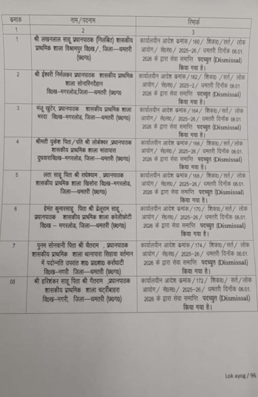 CG News : धमतरी। साल 2007 में हुए शिक्षाकर्मी भर्ती घोटाले में जिला प्रशासन ने कड़ा कदम उठाया है। इस कार्रवाई के तहत धमतरी जिले के 8 प्रधान पाठकों को बर्खास्त कर दिया गया है। जांच में यह सामने आया कि ये सभी फर्जी दस्तावेजों के सहारे नौकरी हासिल कर लंबे समय तक शिक्षा विभाग में पदस्थ रहे।