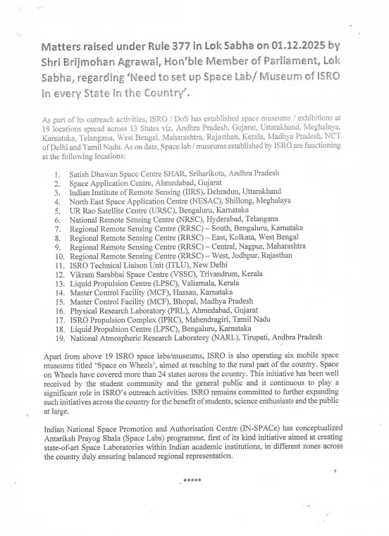 सांसद बृजमोहन अग्रवाल ने 1 दिसंबर 2025 को लोकसभा में नियम 377 के तहत यह मुद्दा उठाया था। उन्होंने कहा था कि अंतरिक्ष विज्ञान और तकनीक से जुड़ी सुविधाएं कुछ बड़े शहरों तक सीमित नहीं रहनी चाहिए। देश के हर राज्य के युवाओं को इसका लाभ मिलना चाहिए, ताकि वैज्ञानिक सोच विकसित हो और छात्र राष्ट्र निर्माण से जुड़ सकें।