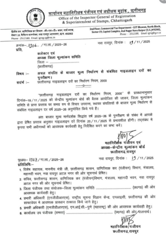 CG News: विभागीय आदेश में सभी जिला रजिस्ट्रार और उप रजिस्ट्रार कार्यालयों को निर्देश दिए गए हैं कि वे 20 नवंबर 2025 से नई गाइडलाइन दरों को सख्ती से लागू करें और आम जनता को इसकी सूचना दें।