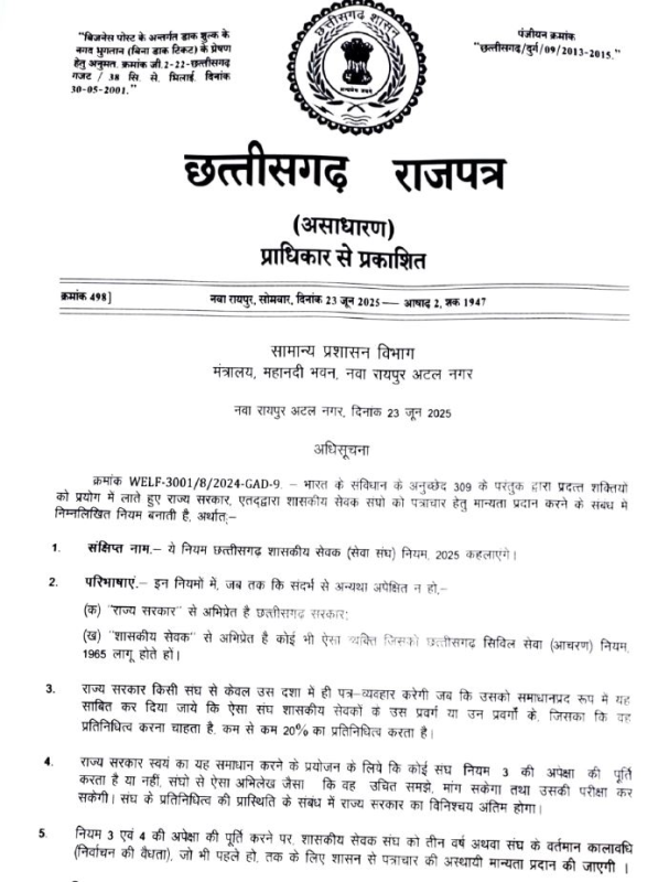 CG News : साय सरकार का बड़ा फैसला, अब कर्मचारी संघों को उनके कार्यकाल के अनुसार मान्यता मिलेगी, 58 साल बाद संशोधन,फेडरेशन की मांग पूरी, देखें अधिसूचना