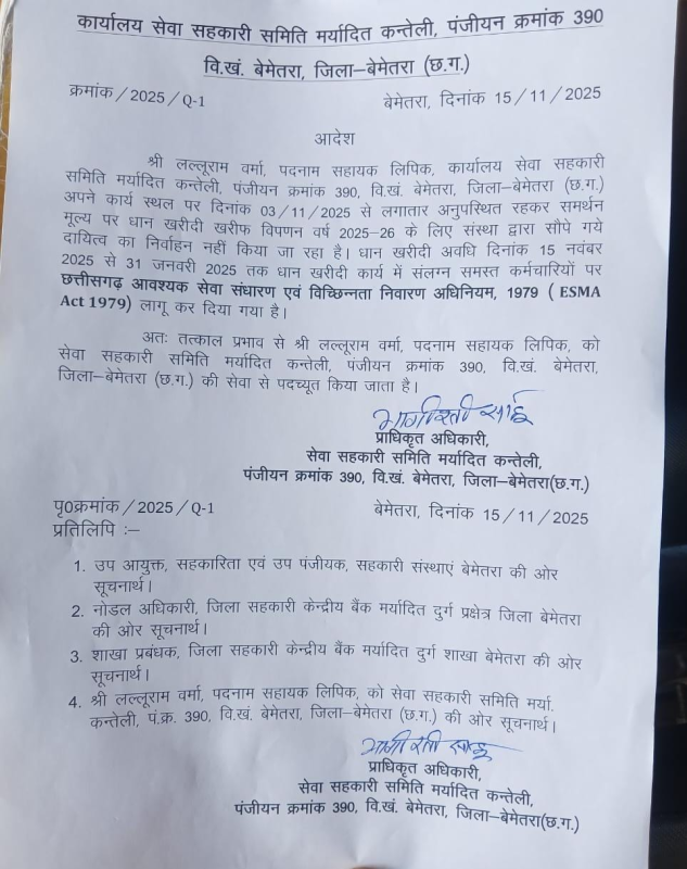 CG News : बेमेतरा। धान खरीदी सीजन 2025–26 को सुचारू रूप से संचालित करने प्रशासन ने कड़ा रुख अपनाया है। इसी क्रम में सेवा सहकारी समिति मर्यादित कन्तेली से एक बड़ी कार्रवाई सामने आई है, जहां सहायक लिपिक लल्लूराम वर्मा की सेवा तत्काल प्रभाव से समाप्त कर दी गई है।