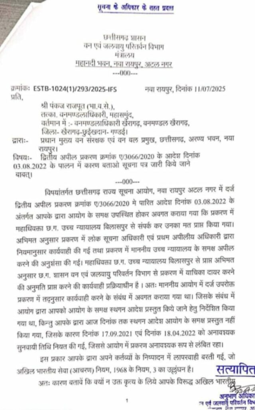 CG News : रायपुर। छत्तीसगढ़ में सूचना का अधिकार (RTI) अधिनियम को गंभीरता से न लेना खैरागढ़ वनमंडल के वनमंडल अधिकारी (DFO) पंकज राजपूत को भारी पड़ गया। सूचना आयोग के आदेशों का पालन न करने के कारण वन एवं जलवायु परिवर्तन विभाग ने उनके खिलाफ अखिल भारतीय सेवा (अनुशासन एवं अपील) नियम 1969 के तहत अनुशासनात्मक कार्रवाई शुरू करने के लिए 11 जुलाई 2025 को शो-कॉज नोटिस जारी किया है। नोटिस में पंकज राजपूत से 15 दिनों के भीतर जवाब मांगा गया है, जिसमें कर्तव्यों में लापरवाही और अखिल भारतीय सेवा (आचरण) नियम 1968 के उल्लंघन का आरोप लगाया गया है।