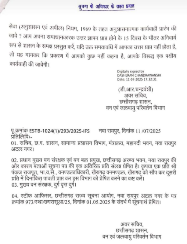 सूचना आयोग के 2022 के आदेश पर कार्रवाई न होने की जानकारी 2025 में सामने आने पर अवर सचिव, सूचना आयोग ने शासन से आदेश के पालन की स्थिति मांगी। इसके बाद वन विभाग ने 11 जुलाई 2025 को पंकज राजपूत, जो अब खैरागढ़ वनमंडल में पदस्थ हैं, को शो-कॉज नोटिस जारी किया। नोटिस में कहा गया कि राजपूत ने अपने कर्तव्यों में लापरवाही बरती, जो आचरण नियमों का उल्लंघन है। उनसे 15 दिनों में जवाब मांगा गया है कि क्यों न उनके खिलाफ अनुशासनात्मक कार्रवाई शुरू की जाए।