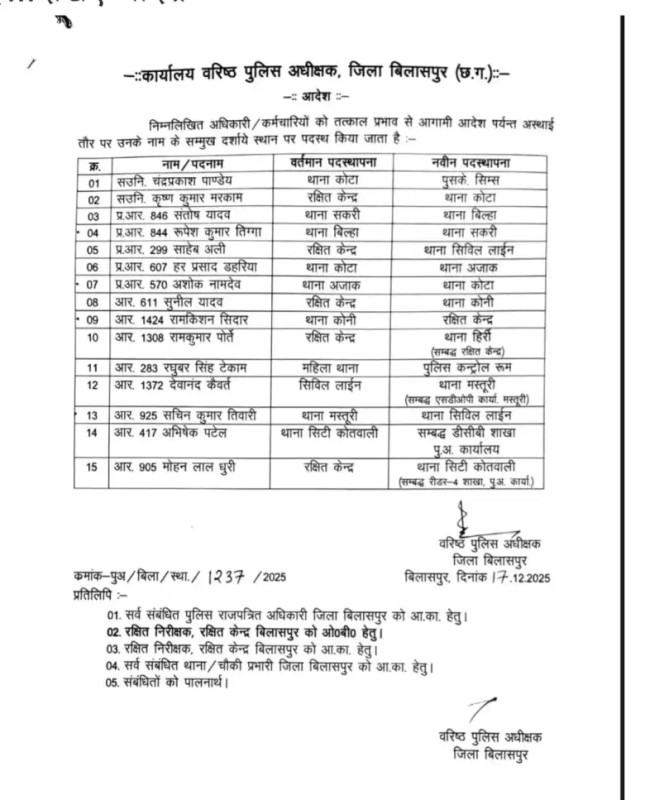 CG Police Transfer : बिलासपुर। जिले में पुलिस महकमे में बड़ा प्रशासनिक फेरबदल किया गया है। एसपी रजनेश सिंह ने जिले के 15 पुलिसकर्मियों के तबादले के आदेश जारी किए हैं। इस तबादला सूची में विभिन्न थानों और शाखाओं में पदस्थ अधिकारी-कर्मचारी शामिल हैं। जारी आदेश के अनुसार तबादलों में 2 सहायक उप निरीक्षक (ASI), 5 हेड कांस्टेबल, 8 कांस्टेबल शामिल हैं। सभी को तत्काल प्रभाव से नई पदस्थापना दी गई है।