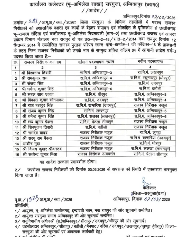 CG Police Transfer : सरगुजा में 16 राजस्व निरीक्षकों के तबादले, कलेक्टर ने जारी किया आदेश