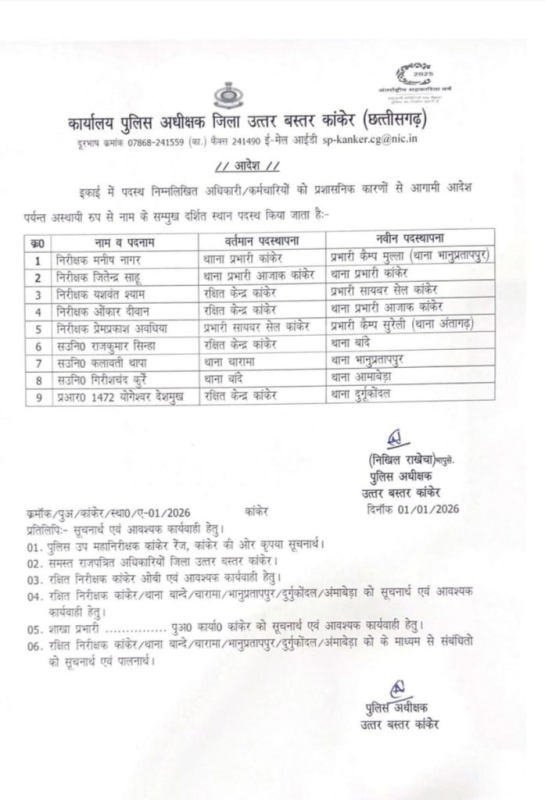 CG Police Transfer : कांकेर। नए साल के पहले ही दिन कांकेर पुलिस विभाग में बड़ा प्रशासनिक फेरबदल देखने को मिला है। जिले की कमान संभालते ही एसपी निखिल राखेचा ने सख्त रुख अपनाते हुए तबादला आदेश जारी किया है। इस आदेश के तहत 5 निरीक्षक, 3 सहायक उपनिरीक्षक और 1 प्रधान आरक्षक को इधर से उधर किया गया है।
