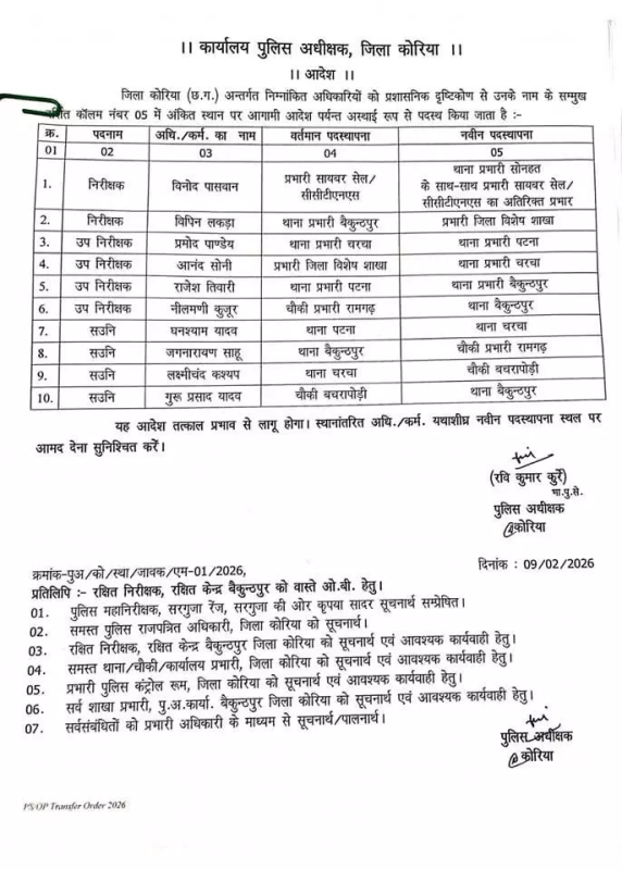 CG Police Transfer : कोरिया। जिले में पुलिस महकमे में एक साथ बड़ा प्रशासनिक बदलाव देखने को मिला है। पुलिस अधीक्षक रवि कुमार कुर्रे ने प्रशासनिक मजबूती और बेहतर कार्यप्रणाली के उद्देश्य से 69 पुलिस अधिकारी-कर्मचारियों के तबादले के आदेश जारी किए हैं।