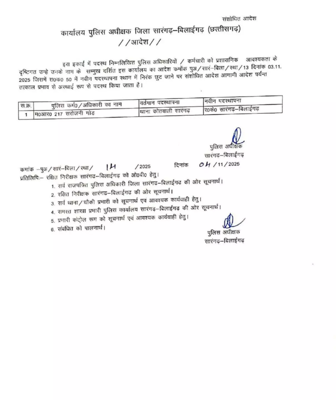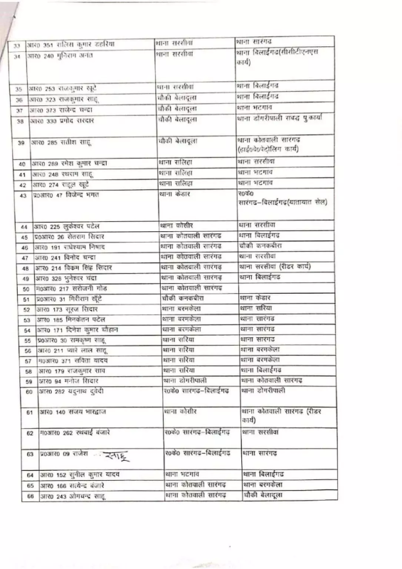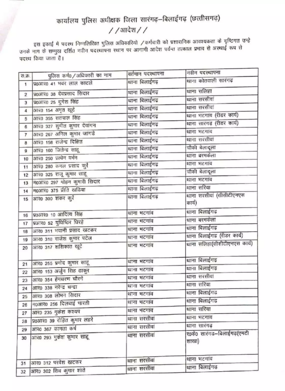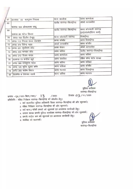 CG Police Transfer : सारंगढ़-बिलाईगढ़। जिले में पुलिस महकमे में एक बार फिर व्यापक तबादला अभियान चलाया गया है। पुलिस अधीक्षक कार्यालय से जारी आदेश के तहत कुल 81 पुलिसकर्मियों का स्थानांतरण किया गया है। इनमें प्रधान आरक्षक और आरक्षक स्तर के अधिकारी शामिल हैं।