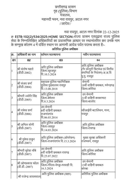CG Police Transfer : रायपुर। राज्य सरकार ने पुलिस महकमे में अब तक की सबसे बड़ी प्रशासनिक सर्जरी करते हुए राज्य पुलिस सेवा के 95 अधिकारियों का एक साथ तबादला कर दिया है। गृह (पुलिस) विभाग द्वारा जारी आदेश के बाद पुलिस प्रशासन में हलचल तेज हो गई है। इस बड़े फेरबदल के तहत 35 अतिरिक्त पुलिस अधीक्षक (ASP) और 60 उप पुलिस अधीक्षक (DSP) स्तर के अधिकारियों को नई जिम्मेदारियाँ सौंपी गई हैं।