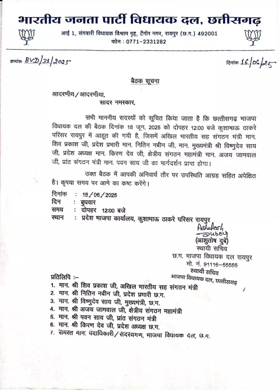 CG Politics: रायपुर। भारतीय जनता पार्टी छत्तीसगढ़ विधायक दल की बैठक 18 जून को होगा। भाजपा प्रदेश कार्यालय में प्रदेश प्रभारी नितिन नबीन दोपहर 12 बजे बैठक लेंगे। इस दौरान नितिन नबीन संकल्प से सिद्धि