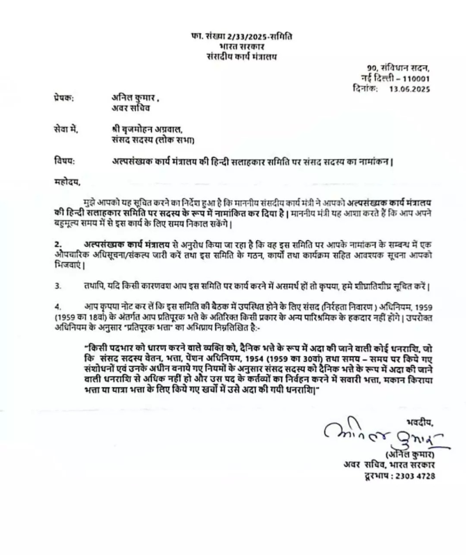 CG Politics: अल्पसंख्यक कार्य मंत्रालय जैसे महत्वपूर्ण विभाग की हिन्दी सलाहकार समिति में सदस्य के रूप में जुड़ना मेरे लिए गौरव का विषय है। मैं प्रधानमंत्री नरेंद्र मोदी जी, गृहमंत्री अमित शाह जी एवं संसदीय कार्य मंत्री किरेन रिजिजू का हृदय से आभार व्यक्त करता हूं जिन्होंने मुझे यह दायित्व सौंपा।