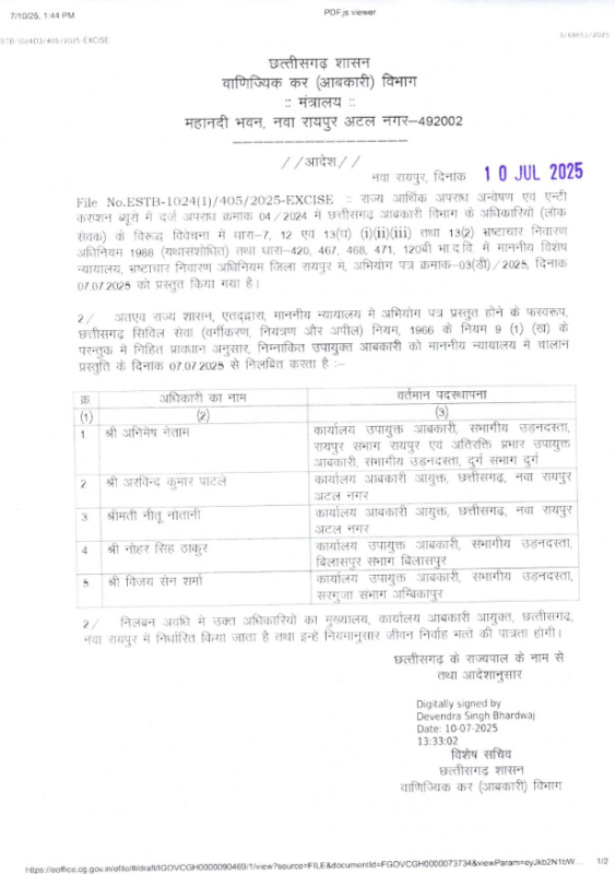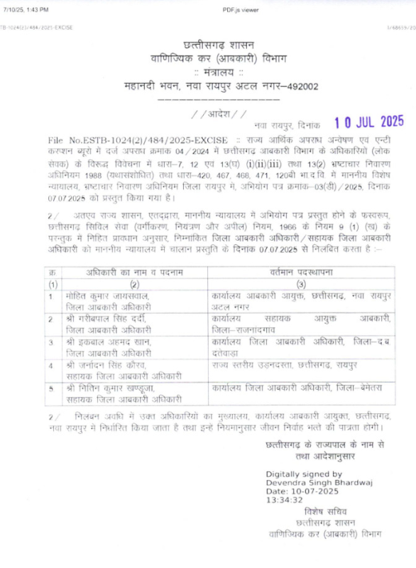 CG Suspend : 22 आबकारी अधिकारी सस्पेंड, 2174 करोड़ के घोटाले में अब तक की सबसे बड़ी कार्रवाई, देखें आदेश...