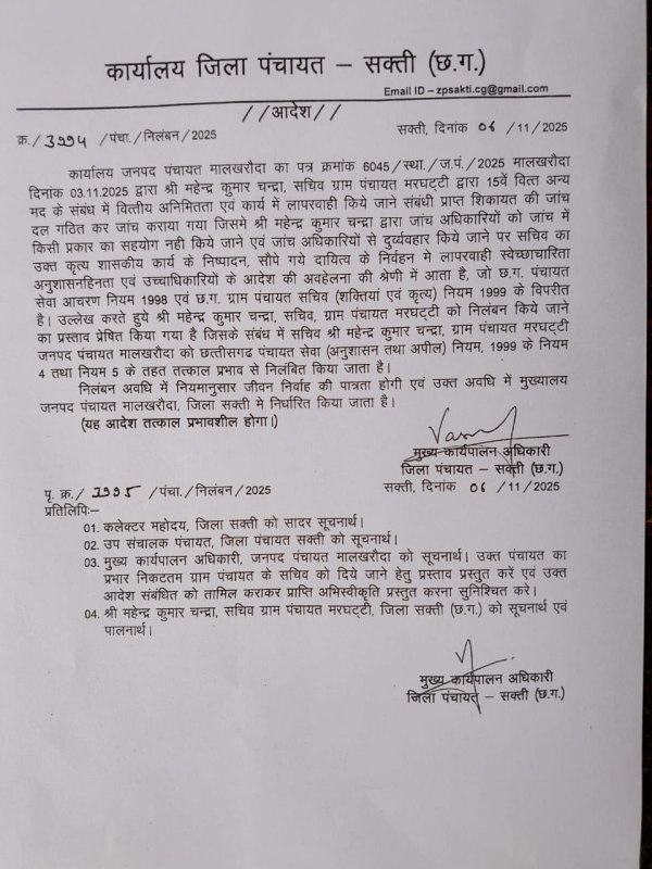 CG Suspended : सक्ती। सक्ती जिला पंचायत प्रशासन ने बड़ी कार्रवाई करते हुए ग्राम पंचायत मरघट्टी के सचिव महेंद्र कुमार चंद्रा को निलंबित कर दिया है। सचिव पर लापरवाही और वित्तीय अनियमितताओं के गंभीर आरोप लगे थे। शिकायतों के आधार पर की गई जांच में गंभीर गड़बड़ियों की पुष्टि हुई है।