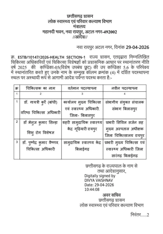 CG Transfer : स्वास्थ्य विभाग में फेरबदल, तीन डॉक्टरों के तबादले, देखें लिस्ट